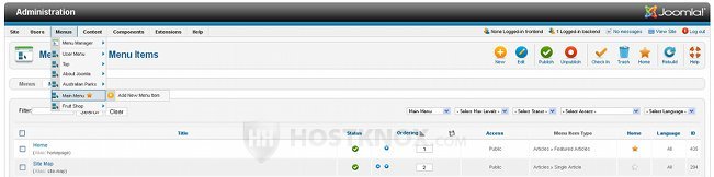 To make the new articles featured, mark the checkboxes in front of them and click on the Featured button in the upper right corner. You can configure different options connected with the featured articles displayed on the home page, such as the number of articles and the order in which they are shown, from the Home item of the Main Menu (Menus>Main Menu):