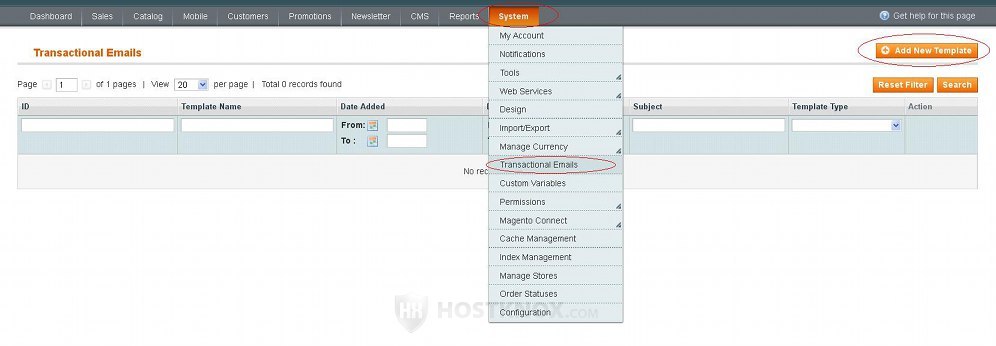 To manage email templates log in to the backend of your site and go to System menu>Transactional Emails. On the page that opens there's a table with the templates that you've added and edited. If you haven't added templates it should be empty. Click on the Add New Template button in the upper right corner to add/edit email templates: