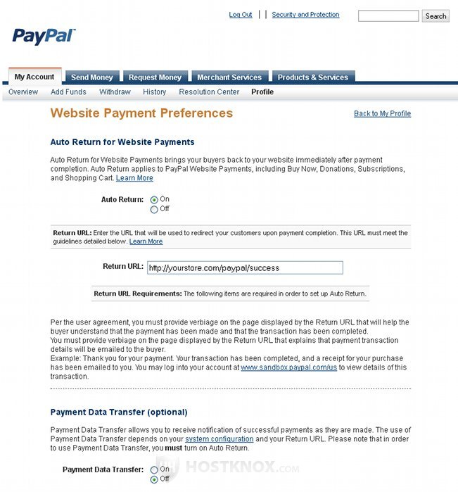Another useful option that you can turn on from your test PayPal business account is the Auto Return for Website Payments. It brings your customers back to your site after completing the payment on PayPal's site. It doesn't apply to all the payment methods. To enable it, log in to your PayPal business account, click on Profiles, in the Selling Preferences column click on Website Payment Preferences. Then set the Auto Return option to On and type the return URL (e.g. http://yourstore.com/paypal/success):