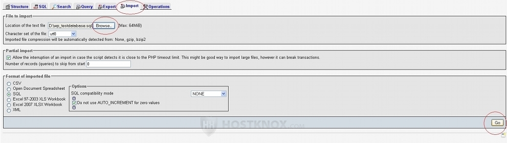 After you locate the SQL dump file click on the Go button in the lower right corner of the Import page. You don't have to configure any of the other settings. The database tables will be uploaded and imported into your new database. With phpMyAdmin you can't import very big databases, so you should keep this in mind. The maximum size of the database that you want to import through phpMyAdmin should not exceed 64 MB. You can import larger databases through SSH.