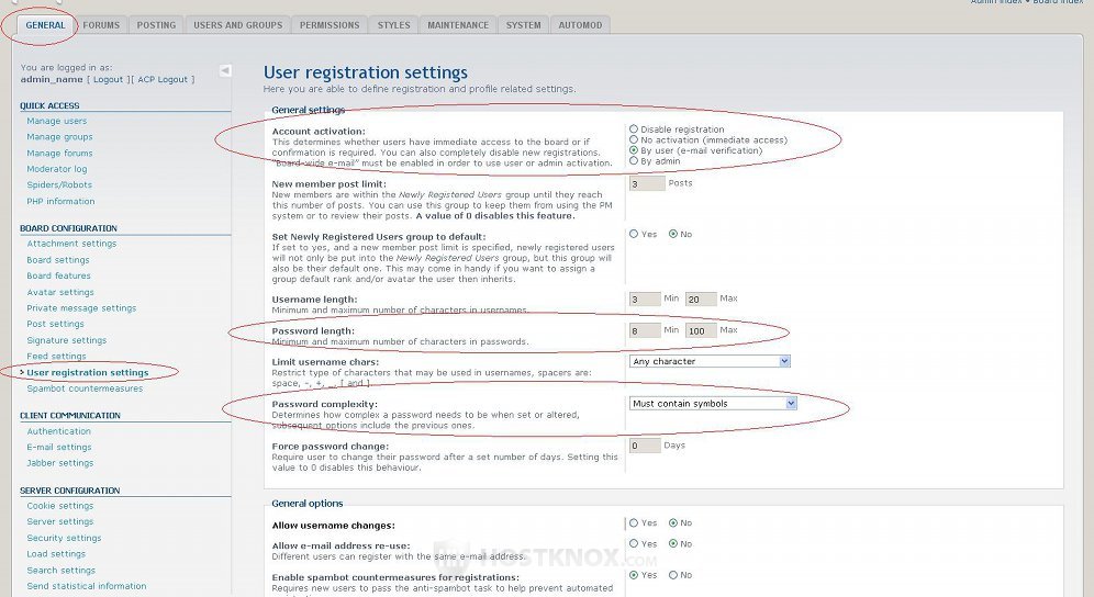 There are also some settings that you can configure from the administration control panel to make sure that the accounts of your users are better protected and more difficult to hack. From the User registration settings (General tab>User registration settings) you can change the password length and its complexity.