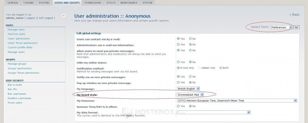 Then on the new page that opens from the drop-down menu in the upper right corner select Preferences. New options will appear on the page. From the drop-down menu labeled My board style select the style that you wish to be used by all the guests on your site. In our example we'll select the style we installed earlier: