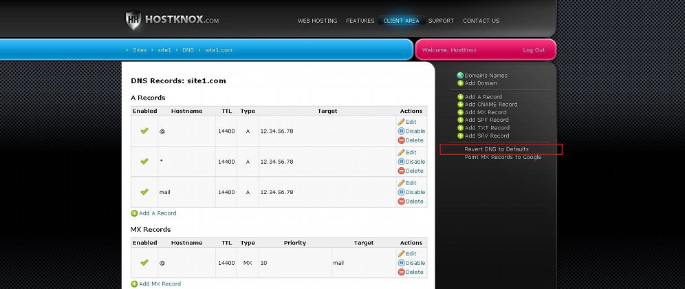To do this, go to the Domain Names and DNS Settings section of the HostKnox control panel. Click on the Edit DNS records button for the domain and on the page that lists the DNS records click on the button Revert DNS to Defaults (it's in the black area on the right):