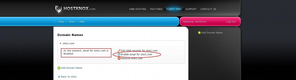 Type the domain name in the text field and click on the Add Domain button under it. Type the domain name without the http:// part (e.g. yourdomain.com). When you add the domain name the HostKnox control panel will automatically create the necessary DNS records for the domain.