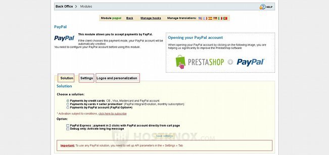 There are three tabs with options: Solution, Settings, Logos and personalization. The Solution tab is opened by default. From the options displayed on this tab page we'll mark the button for Payments by credit cards; with this option enabled customers can pay with their credit cards or by using their PayPal accounts (if they have such).