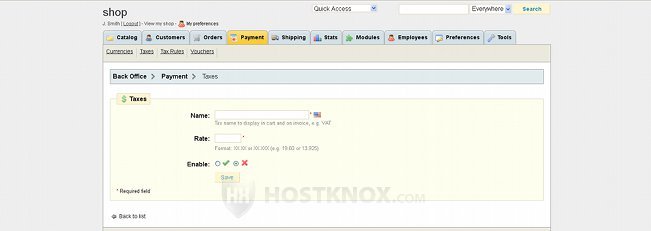 In the corresponding fields you have to type a name for the tax and a tax rate. Then choose whether you want to enable the tax and click on the Save button. Once you do it you'll be taken back to the Taxes sub-tab page and the new tax will be added to the table with the other taxes.